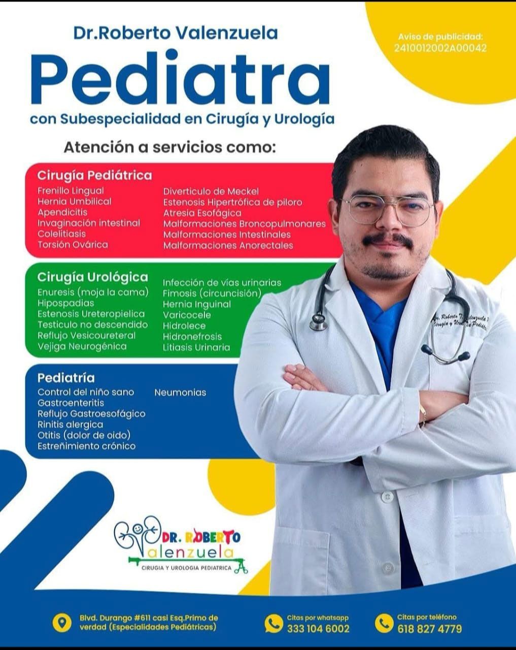 La consulta del Dr. Roberto Tadeo Valenzuela Ríos ofrece atención médica pediátrica especializada con un enfoque integral que incluye evaluación clínica, diagnóstico preciso, tratamiento médico o quirúrgico y seguimiento continuo. El objetivo es atender de forma adecuada las necesidades de salud de cada paciente pediátrico, considerando su edad, desarrollo y condición clínica.